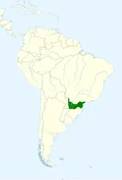 Das relativ kleine Verbreitungsgebiet ist auf das östliche zentrale Südamerika beschränkt und umfasst den Südwesten Brasiliens, den angrenzenden Osten von Paraguay sowie den äußersten Nordosten Argentiniens. Die Größe des Gesamtverbreitungsgebietes wird auf 184.000 km² geschätzt.[2]