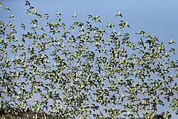 Wellensittiche sind schnelle und ausdauernde Flieger. Das ist an ihrer aerodynamischen Gestalt und den langen spitzen Flügeln zu erkennen. Die beiden mittleren Steuerfedern stabilisieren den geradlinigen und schnellen Flug. Ihr Flugverhalten im Schwarm erinnert an die eleganten Starenformationen mit den schnellen Richtungswechseln und den wellenartigen Flugbewegungen.[35]
