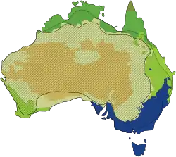 Der Wellensittich zählt zur Fauna Australiens und ist in seiner natürlichen Verbreitung auf den australischen Kontinent beschränkt. Er ist Nomade und Bewohner des australischen Outbacks und seiner Randzonen.[7] Er besiedelt fast das ganze australische Festland und fehlt nur im äußersten Südwesten, auf der mit tropischem Regenwald bestandenen Kap-York-Halbinsel und in den meisten Küstenregionen Nord- und Ostaustraliens.[8] Es gibt Sichtungen von Wellensittichen in Tasmanien. Dabei handelt es sich aber um Gefangenschaftsflüchtlinge.[6]