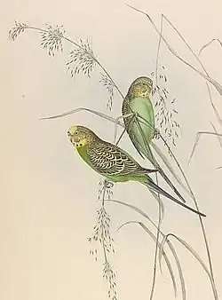 1805 veröffentlichten George Shaw und sein Illustrator Frederick Polydore Nodder erstmals eine ausführliche Beschreibung des Wellensittichs. 1831 wurde ein ausgestopftes Exemplar in einem Londoner Museum gezeigt.[47] 1840 war es vermutlich John Gould, der erstmals lebende Exemplare nach England und damit nach Europa einführte. Seit diesem Zeitpunkt wurden mit jedem Schiff, das von Australien nach Europa fuhr, Wellensittiche transportiert.[48] Die Welterstzucht gelang Saulnier in Frankreich 1846, der Zoo in Antwerpen hatte 1850 Erfolg, 1855 gelang einer Privathalterin die deutsche Erstzucht.[49] In den USA ist die Erstzucht erst für 1909 belegt.[50] Durch eine Vogelausstellung in Antwerpen im Jahre 1850 wurde der Vogel in ganz Europa bekannt. Kurz darauf wurden große Zahlen an Wildfängen nach Europa importiert. Der erste Haltungsbericht, der als Pflegeanleitung verstanden werden kann, stammt von Jules Delon, der 1854 für eine Versammlung der Societé Imperiale Zoologique d’Acclimation in Paris berichtete.[43] Ab etwa 1846/47 sind die Vögel häufiger im Handel zu finden.[51] Bereits 1859 war der Vogel in Deutschland zumindest in Großstädten unter dem Namen Undulatus-Papagei gemeinhin bekannt.[52] Der Bedarf wurde zunächst durch Massenimporte gedeckt, was zu einem erheblichen Preisverfall führte.[53] Beispielsweise wurden von einem Londoner Händler vom 10. Februar bis zum 27. Juli 1878 14.069 Paare, von September 1878 bis Januar 1879 noch einmal 79.655 Paare verschifft.[54] Diese Massenexporte fanden erst 1894 mit dem heute noch gültigen allgemeinen Ausfuhrverbot für Vögel aus Australien ein Ende.[43] Bereits um 1880 existierten kommerziell ausgerichtete Massenzuchten in England, Frankreich und Deutschland, Karl Ruß schätzte die „Jahresproduktion“ in Deutschland 1880 auf 50.000 Tiere.[53] Mit Ausbruch des Ersten Weltkrieges und dem daraufhin zusammenbrechenden Vogelmarkt wurden beim französischen Großzüchter Bastide etwa 120.000 Wellensittiche getötet, da sie nun nicht mehr in den Verkauf gehen konnten.[55]