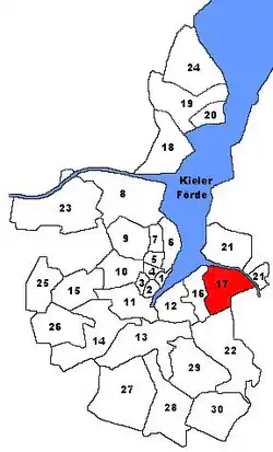 - ↑ a b Quartalsdaten aus den Stadtteilen I 2024. (PDF; 1,57 MB) Stadt Kiel, S. 4, abgerufen am 26. Juni 2024.