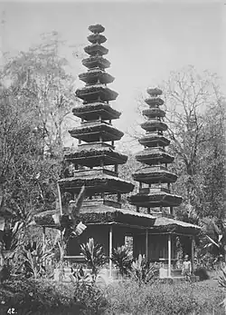 Balinesische Hindutempel gründen mythologisch auf Schildkröten und Schlangen (Nagas), welche die Unterwelt bevölkern. Die mittlere der drei balinesischen Welten stellt den einem Gott als Wohnsitz dienenden Schrein dar, an dem die Gläubigen Opfer bringen. Die stets in ungerader Zahl vorhandenen Pagodendächer darüber verkörpern den Himmelsberg Mahameru („Großer Meru“) und repräsentieren in Bali die Oberwelt.[14]