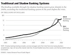 Die Subprime-Falschbewertungen verteilten ca. 7 Billionen US-Dollar Schulden um, etwas weniger als die Dotcom-Blase, die 2000 mehr als 8 Billionen US-Dollar Papiervermögen umverteilte. Trotzdem hatte die Finanzkrise ab 2007 sehr viel schwerere Folgen als die Dotcom-Krise.[27] Nach Ansicht der Mehrheit der Mitglieder der Financial Crisis Inquiry Commission,[28] des deutschen Sachverständigenrates zur Begutachtung der gesamtwirtschaftlichen Entwicklung[29] und der meisten Ökonomen wurden die Auswirkungen des Platzens der Immobilienblase durch eine strukturelle Schwäche des amerikanischen Finanzsystems erheblich verstärkt. Aufgrund von Lücken in der Bankenregulierung konnten z. B. die Subprime-Kredite auf Schattenbanken übertragen und dadurch die Bankenaufsicht umgangen werden. Wären die Subprime-Kredite in den Bankbilanzen geblieben, dann hätten die Banken wegen der Pflicht zur Hinterlegung mit Eigenkapital viel weniger Subprime-Kredite vergeben können und hätten einen Anreiz gehabt, die Bonität der Kreditnehmer zu prüfen.[29] Durch die Übertragung der Subprime-Kredite in Schattenbanken musste kein Eigenkapital hinterlegt werden, dadurch war ein sehr viel größerer Leverage-Effekt möglich.[29] Anders als normale Banken waren Schattenbanken nicht gezwungen, Zahlen zu veröffentlichen, die Rückschlüsse auf ihre Risikopositionen zuließen,[30] ihre Risikopositionen wurden nicht von der Bankaufsicht überwacht, für sie gab es keine Einlagensicherung und die Zentralbank fühlte sich für diese Nicht-Banken zunächst nicht als Kreditgeber letzter Instanz zuständig. Deshalb kam es bei den Schattenbanken nach Platzen der Immobilienblase zu einem Bank Run und einer Kreditklemme, wie sie der klassische Bankensektor zuletzt in der Weltwirtschaftskrise ab 1929 erlebt hatte.[31]