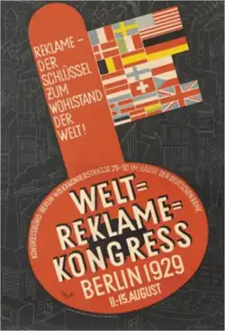 Der Weltreklamekongress vom 11. bis 15. August 1929 war bis lange nach dem Zweiten Weltkrieg die größte internationale Tagung, die jemals in Deutschland stattgefunden hat.[1] Rund fünftausend Werbefachleute, Diplomaten, Politiker und Unternehmer allein aus dem Ausland wurden von den Veranstaltern erwartet, davon über dreitausend aus den Vereinigten Staaten von Amerika.[2] Das Motto des Kongresses drückte das Selbstbewusstsein der noch jungen Werbebranche aus: „Reklame, der Schlüssel zum Wohlstand der Welt“.[3]