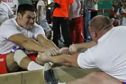 • Mas-Wrestling, ein von sibirischen Völkern stammender Sport. Auf Anweisung des Kampfrichters greifen die Wettkämpfer mit ihren Handflächen einen 50 Zentimeter langen Stock und ziehen beide daran. Quetschen oder Stoßen sind während des Wettkampfs nicht zulässig, das Berühren der Hand des Gegners ist ebenfalls verboten. Der Athlet, der den Stock zu seiner Seite zieht, setzt den Kampf fort, bis sein Gegner den Stock loslässt. Gewinner ist auch, wer den Körper seines Gegners auf seine Seite zieht. Darüber hinaus gilt das Spiel als gewonnen, wenn die Füße des Gegners das Stützbrett verlassen, das zwischen beiden am Boden ist. Es gibt Gewichtsklassen. Um zu siegen, muss ein Wettbewerber zwei Runden gewinnen.[11]