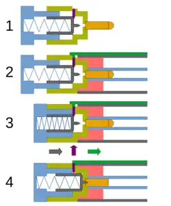 - Der Schütze betätigt den Abzug, indem er die Abzugsstange in Richtung Mündung schiebt. Somit liegt das hintere Ende der Abzugsstange nicht mehr über dem Haltestift. Der Haltestift wird durch den unter Druck stehenden Schlagbolzen herausgedrückt. Der Schlagbolzen wird von der Schlagfeder beschleunigt, schlägt auf den Patronenboden auf und zündet die Treibladung. Die Hülse verbleibt in der Waffe.[6]