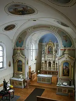 Der Hochaltar hat einen neuromanischen Aufbau mit einem Altarbild von Melchior Paul von Deschwanden und zeigt die „Himmelfahrt Mariens“. Links davon befindet sich eine Figur der hl. Notburga, rechts eine des hl. Wendelin. Sie entstanden wie die zwei Engel im Aufsatz und das Kruzifix in der Tabernakelnische um das Jahr 1870. Auch der linke Seitenaltar hat einen neuromanischen Aufbau. Das Altarbild von Johann Boch aus dem Jahr 1872 zeigt die hl. Anna mit der lesenden Maria. Das Altarbild des rechten Seitenaltares mit neuromanischem Aufbau zeigt den hl. Josef mit Jesus. Vor dem linken Seitenaltar befindet sich die Grabstätte von Merbod unter einer neuromanischen Mensa, die von vier Säulen getragen wird. Darüber befindet sich eine barocke Figur des „Selige“n. Da es Brauchtum ist, von der „Keule des Seligen Merbod“ ein Stück abzuschneiden und mit nach Hause zu nehmen, ist es gestattet, dies zu tun. Diese Stücke sollen die wundertätige Wirkung Merbods mittragen.