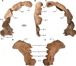 - Die Epiparietalia „ep 1“ bis „ep 3“ sind pachyostotisch verdickt, mit einer breiten Basis und stark nach außen und vorne („anterodorsal“) gekrümmt, so dass sie den äußeren Rahmen der paarigen Fenster im Nackenschild überlappen. Bei verwandten Formen ist dieses Merkmal auf das Epiparietale „ep 1“ beschränkt.