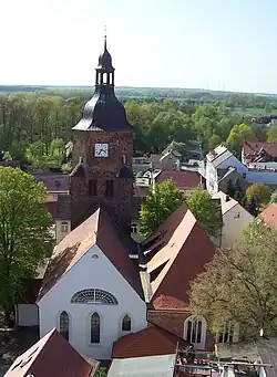 Der erste Kirchenbau an dieser Stelle dürfte bereits Ende des 13. Jahrhunderts im Zuge der Christianisierung der hier lebenden Sorben (Wenden) entstanden sein. Diese wendische Kirche war aus Feld- und Raseneisensteinen gebaut. Im Zuge der Reformation wurde die Kirche 1540 evangelisch, der Religion der Schlossherrschaft derer von Schlieben folgend. Bei einem Stadtbrand im Jahr 1619 brannte die Kirche ab. Weitere Schäden entstanden bei einem Brand im Jahr 1642. Erhalten blieb nur der Turmsockel, der noch heute den unteren Teil des Kirchturms bildet.