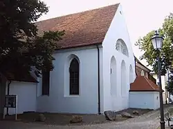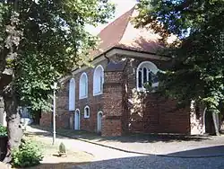 Auf den alten Fundamenten wurde, wohl nach Ende des Dreißigjährigen Kriegs[1] um 1650[2], eine neue schlichte rechteckige Backsteinkirche mit einer flachen Decke, sichtbaren Querbalken und hohen Spitzbogenfenstern errichtet. Der Westturm wurde zunächst nicht wieder aufgebaut. An der nördlichen Seite dieser Dorfkirche wurde eine Schlosskapelle angebaut. Diese Kapelle diente als Raum für die Gottesdienste der deutschen Schlossherren. Für diese und einige wenige Deutsche wurde hier nach Bedarf in Deutsch gepredigt.
