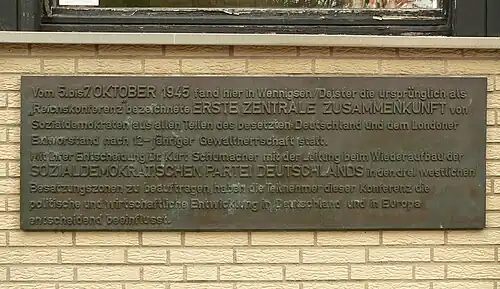 - ↑ SPD-Gemeindeverband Wennigsen: Deutsche Geschichte in Wennigsen. Ortsdokumente vom Wiederaufbau von Staat und Gesellschaft, Kurt Schumacher und die Reichskonferenz in Wennigsen 1945. Begleitheft zur Ausstellung. Wennigsen, 2000.