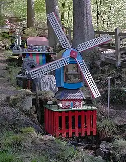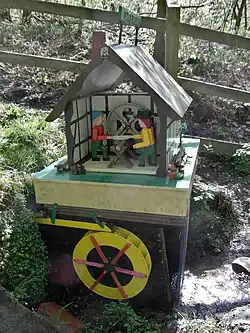 Bei den Wasserrädern wurden eine Schutzhütte, Sitzgelegenheiten und ein immer wieder reparaturbedürftiges großes Schaukelpferd aufgebaut. Der Bachlauf ist mit einem einfachen Holzgeländer umzäunt.