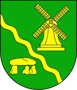 Blasonierung: „In Grün ein gesenkter goldener Schrägwellenbalken, begleitet oben von einer goldenen holländischen Windmühle, unten von einem aus drei Tragsteinen und einer Deckplatte bestehenden goldenen Steingrab.“[7]
