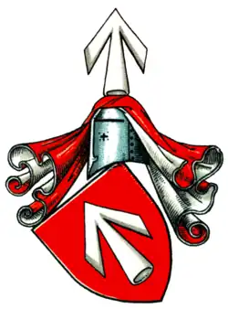 Das Wappen zeigt in Rot ein senkrecht stehendes silbernes Pfeileisen. Auf dem Helm mit rot-silbernen Decken das silberne Pfeileisen.