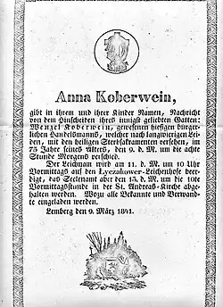 Am 27. Oktober 1809 fungierte Koberwein in der Salzlieferung von 30.000 „Zenteln“ an Russland als Zwischenhändler zu einem nachteilig günstigen Preis.[6] 1817 wurde nach früherer Feilbietung übriges Inventar Koberweins wegen Schulden versteigert.[7] 1818 kündigte die Lemberger Zeitung die Versteigerung von Koberweins auf 23255 Fl. geschätztem Haus Nr. 455 wegen Steuerschulden an die Stadt an.[8] Am 26. Mai 1820 kündigte sie die Versteigerung von Gütern seiner Frau Anna an.[9] 1825 wurde sein Haus Nr. 425 versteigert.[10]