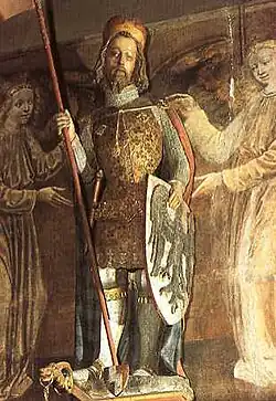 Ab der zweiten Hälfte des 11. Jahrhunderts wandelte sich das Bild. Er erschien nun als Krieger in voller Rüstung und wurde zum Beschützer des Landes in Not und Kriegsgefahr. Im 12. Jahrhundert entstand die Vorstellung, dass Wenzel der eigentliche, ewige Herrscher Böhmens sei, der den Frieden im Land garantiere. Die regierenden Fürsten galten als seine irdischen Stellvertreter, die mittelalterliche Nation als sein Gesinde (familia sancti Venceslai).[17]