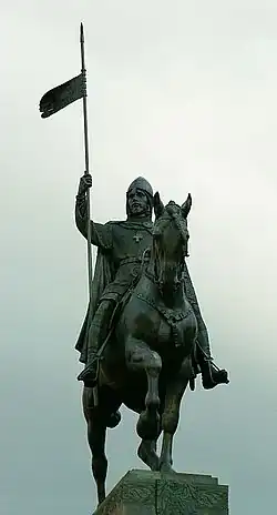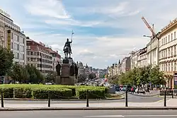 - 1912 schuf der tschechische Künstler Josef V. Myslbek das Wenzelsdenkmal (Pomník svatého Václava). Es zeigt den Heiligen Wenzel als Landespatron in Rüstung mit Harnisch und Lanze sowie zu seinen Füßen die vier Schutzheiligen Ludmilla und Prokop (vorn) und Anežka (Agnes) und Vojtěch (Adalbert) (hinten). Der ornamentale Schmuck des Denkmals stammt von Celda Klouček (1855–1935)[3], die architektonische Gestaltung von Alois Dryák.