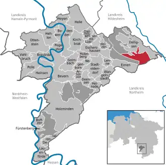 Es hat eine Fläche von 15,84 km²[1] und grenzt im Uhrzeigersinn im Westen an das gemeindefreie Gebiet Eimen, im Norden an das gemeindefreie Gebiet Grünenplan und im Norden und Osten an den Flecken Delligsen des gleichen Landkreises. Im Süden grenzt das Gebiet an die Stadt Einbeck im Landkreis Northeim.