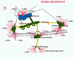 - 7 Panzerkasematten mit je 3 Maschinengewehren
