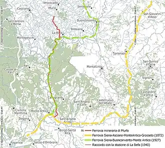 ![]() Bergwerksbahn (rot) Bahnstrecke Siena–Grosetto (gelb, 1872) Bahnstrecke Siena–Monte Atico (grün, 1927) | |||||||||||||||||