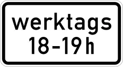 Häufig herrscht im Straßenverkehr bei der Auslegung des Regelungsinhalts des Zusatzzeichens „werktags“ Unklarheit darüber, ob der Samstag ein Werktag ist oder nicht.[11] Auch wenn der Samstag heute zunehmend kein Arbeitstag mehr ist, so gilt er verkehrsrechtlich noch als Werktag. Das Oberlandesgericht Hamm entschied im März 2001, dass der Begriff nicht mit „Arbeitstag“ gleichzusetzen sei, sondern vielmehr als Gegensatz zum Begriff „Sonn- und Feiertag“ zu verstehen ist; der Samstag sei im „allgemeinen Sprachgebrauch“ auch heute noch ein Werktag.[12] Zur Klarstellung wird ein Zusatzzeichen, etwa „Mo.–Fr.“, verwendet.[13] Das ist auch bei Parkuhren zu beachten, bei denen der Samstag ebenfalls als Werktag gilt.
