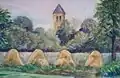 54-438 | Kirchturm von Wuhlgarten | 1954 | Aquarell | ca. 28,5 | 41 | H.Brass 1954 | Wuhlgarten 1954. | Privatbesitz | Auf dem Passepartout links unten der Titel. | |||