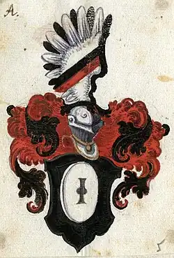 - Blasonierung des Wappens von 1630: In Schwarz ein silberner Mühlstein. Auf dem Helm mit schwarz-roten Helmdecken ein geschlossener Flug, vorne silbern mit einem schwarz-rot geteilten Schräglinksbalken belegt, hinten schwarz.