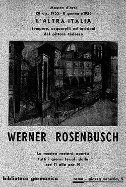 - ↑ Siehe Scan Ausstellungsplakat: L’altra Italia, tempere, acquarelli ed incisioni del pittore tedesco Werner Rosenbusch, 28. Dezember 1955 – 8. Januar 1956, in Rom in der Biblioteca germanica; siehe auch: Zeitungsartikel in der Südwest Presse vom 13. Januar 1956 v. Blida Heynold-v.Graefe, Rom.