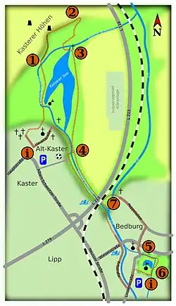 - Stationen: 1–4, Rund um den Kasterer See, Start an der Infotafel am Agatha-Tor in Alt-Kaster.