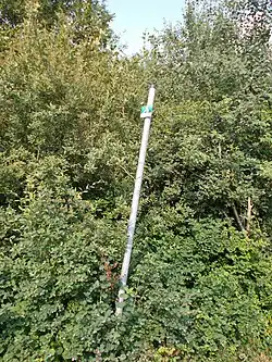 Rechts des Schildes führt Waldweg die Kasterer Höhe Richtung Kaster hinab. An der Brücke über die Kasterer Mühlenerft, links abbiegen. An der Seespitze befindet sich ein Ablaufwehr. Hier führt die Wanderung nach rechts in den Wald. Gegenüber der Infotafel befindet sich hinter der Bank ein Gedenkkreuz. Der 7 ha große See entstand durch den Kohleabbau und ist heute Teil eines Landschaftsschutzgebietes.[2]