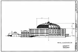 Das aus Backstein und Beton gebaute Hotelgebäude ist sechs Stockwerke hoch und hat 708 Zimmer. Nach außen hat es 16 Seiten und innen ein großes, kreisförmiges Atrium, das die gesamte Höhe des Gebäudes einnimmt. Über den Innenhof spannt sich eine aus Glas und Stahl bestehende, ellipsenförmig strukturierte Kuppel, die einen Durchmesser von knapp 60 m und eine Höhe von knapp 40 m hat. Die Konstruktion wird durch 24 in einer Walze über dem Zentrum verankerte bogenförmige Stahlträger stabilisiert.[9] Um den Innenhof gruppieren sich zwei konzentrische auf jeder Ebene über einen Korridor miteinander verbundene Gebäuderinge, in denen die Hotelzimmer liegen. Zur Zeit ihrer Entstehung war die Kuppel die größte in Stahl-und-Glas-Bauweise auf der Welt und bis 1963 die größte überhaupt auf dem amerikanischen Kontinent. Sie steht in baulicher Tradition der Stahl-und-Glas-Kuppeln von Crystal Palace und der Gartenbauhalle auf der Centennial Exhibition von 1876.[10]
