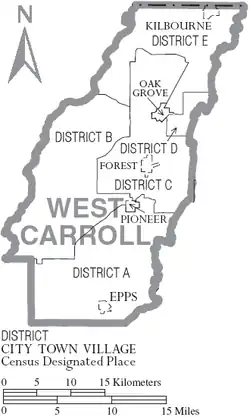 - ↑ West Carroll Parish, Louisiana (Seite nicht mehr abrufbar, festgestellt im Februar 2023. Suche in Webarchiven) Info: Der Link wurde automatisch als defekt markiert. Bitte prüfe den Link gemäß Anleitung und entferne dann diesen Hinweis., Datenblatt mit den Ergebnissen der Volkszählung im Jahre 2000 bei factfinder.census.gov.