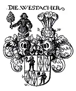 Das in der ersten Hälfte des 17. Jahrhunderts gemehrte Wappen der Westacher ist ein geviertes (quadriertes) Wappen. Es zeigt im 1. und 4. Feld das Stammwappen, im 2. und 3. Feld gespalten je zwei Wecken verwechselter Tinktur.[6]