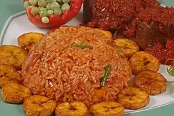Jollof rice (in französischsprachigen Ländern als Benachin bekannt) ist ein mit Tomatenmark eingefärbtes Reisgericht mit verschiedenen Gemüsen und oft mit Fleisch- oder Fischeinlage. Domoda ist ein besonders in der Region Senegambia verbreitetes Eintopfgericht auf Basis von Erdnussbutter, die mit verschiedenen Gemüsen und Gewürzen gekocht und um Rindfleisch, Huhn oder Fisch ergänzt wird. Egusi, auch als egwansi oder agushi sowie unter zahlreichen anderen Namen bekannt, ist eine Suppe aus Melonensamen, Blattgemüsen und Gemüse.[24] Frejon ist eine aus Brasilien stammende, insbesondere in Nigeria und Sierra Leone verbreitete Suppe. Sie ist süß und von puddingartiger Konsistenz und wird aus schwarzen Bohnen hergestellt, denen nach gründlichem Kochen Kokosmilch zugegeben wird. Die Suppe wird mit der Karwoche assoziiert sowie auf Hochzeiten gereicht. Maafe, je nach Region auch unter zahlreichen anderen Namen bekannt, ist ein meist fleischhaltiger Eintopf auf Erdnussbasis, der in Abhängigkeit vom Sämigkeitsgrad auch als Soße verwendet wird. Ndolé ist ein Eintopf mit bitterleaf als Hauptzutat, einem an bitteren Spinat erinnernden Blattgemüse. Die Ogbono soup stammt aus Nigeria, ist unter verschiedenen Namen auch in anderen Teilen Westafrikas bekannt und besteht aus gemahlenen Samen des Buschmangobaums, Blattgemüsen, Tomaten, Okra und oft einer Fleisch- oder Fischeinlage. Wie die ebenfalls in Nigeria populäre Draw soup ist sie von schleimiger Konsistenz, was von der reichlichen Verwendung von Okra herrührt. Palaver sauce, in nicht-englischsprachigen Gebieten auch unter Namen wie kontonmire oder pla'sas bekannt, ist trotz des Namens ein Eintopf mit Fleisch, Fisch und Gemüse, darunter grüne Blätter wie Spinat oder Taro.
