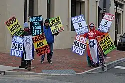 Die Westboro Baptist Church ist eine 1955 ins Leben gerufene, keiner der klassischen christlichen Konfessionen angeschlossene Gemeinde mit Sitz in Topeka und wird als Hass-Gruppe (hate group) angesehen.[1]