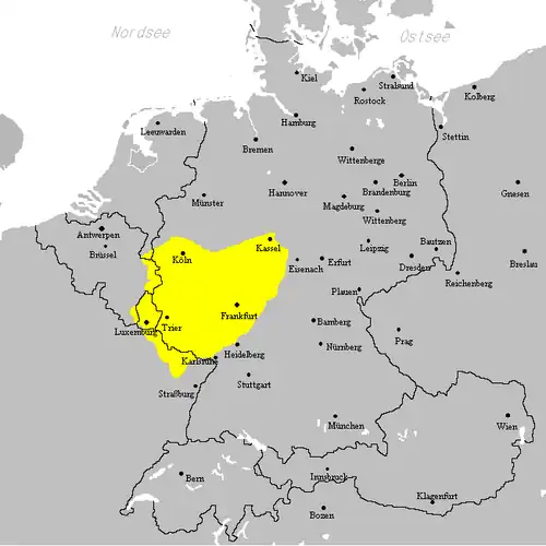 Sprachlich bilden die westmitteldeutschen Dialekte eine Region, die sich von den anderen deutschen Mundarten abgrenzen. Diese Grenzen wurden wesentlich durch die geografische Trennung der Bevölkerung geprägt, die gegenüber dem hügeligen Westdeutschland nach Norden das niederrheinische, das Sauerland und das Münsterland bilden, sowie das Rothaargebirge, nach Osten von den ostmitteldeutschen Dialekten durch den Hohen Meißner und die Rhön, den Spessart und den Odenwald, nach Süden durch den Hardtwald nördlich von Karlsruhe und die Grenze nach Frankreich mit verbleibenden deutschsprachigen Elsässern und Lothringern, die Grenze nach Luxemburg mit deutschsprachigen Luxemburgern und nach Belgien nördlich der Ardennen mit der dortigen deutschen Bevölkerungsgruppe.