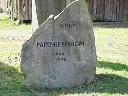 - Ein Gedenkstein, der an das Papageienschießen an einem Papageienbaum (plattdeutsch Papengeyenbom) seit 1528 erinnert.
