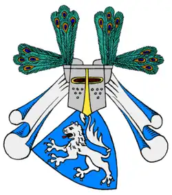 Ein bereits 1258 erscheinendes Wappen zeigt in Blau einen aufgerichteten silbernen Löwen. Auf dem Helm mit blau-silbernen Helmdecken zu beiden Seiten je ein pfahlrechter und ein waagerechter Hiebfänger, bestückt mit natürlichen Pfauenfederbüschen.[2]