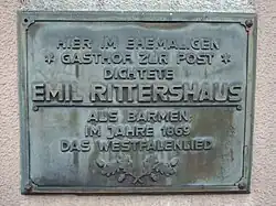 Verfasst wurde dieser Text von dem Kaufmann, Lyriker und Rezitator Emil Rittershaus (1834–1897) während eines Aufenthaltes in Iserlohn. Eine Gedenktafel am Standort des damaligen Gasthofs zur Post am Theodor-Heuss-Ring in der Iserlohner Innenstadt erinnert daran. Erstmals veröffentlicht wurde die bekannteste Version im Wochenblatt für den Wahlkreis Iserlohn-Altena im April 1869. Im Jahr 1871 erschien der Text unter dem Titel Lied des Westfalen in dem Buch Neue Gedichte von Emil Rittershaus.[1]