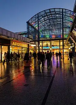 Eine Besonderheit zu anderen Einkaufszentren ist hier die weitgehend fehlende Überdachung der Fußwege. Es sind ausschließlich ein Platz und eine kleine Passage überdacht.