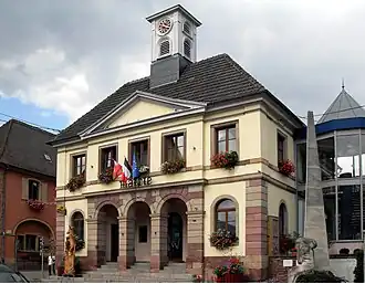 - Beim benachbarten Gebäude Rue de l’Église Nr. 1 handelt es sich um das ehemalige Rathaus von 1776. Die vermauerten, mit Fenstern versehenen Arkaden waren einst offen, da das Erdgeschoss als Marktstätte diente.