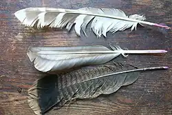 Ab dem 6. oder 7. Jahrhundert kamen Vogelfedern, besonders Gänsekiele, als Schreibwerkzeuge auf. Gänsekiele werden gehärtet, bevor sie zum Schreiben verwendet werden können. Damit die Tinte nicht zu schnell aus dem Federkiel fließt, wird eine Schreibunterlage genutzt, die zwischen 40 und 60 % geneigt ist.[5]