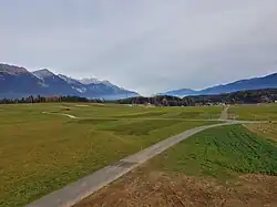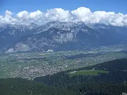 Auf dem Plateau liegen (von West nach Ost) die Gemeinden Grinzens, Axams, Birgitz, Götzens, Natters und Mutters. Diese sechs Gemeinden bilden den Planungsverband Westliches Mittelgebirge mit 18.024 Einwohnern (Stand 1. Jänner 2025)[1] und einer Fläche von 91,70 km², davon 23,6 % Dauersiedlungsraum. Aufgrund der Nähe zur Landeshauptstadt ist die Bevölkerung stark gewachsen, seit 1961 hat sich die Einwohnerzahl mehr als verdoppelt.[2] Die Siedlungsgebiete der Gemeinden gehen teilweise nahtlos ineinander über. Der größte Ort ist Axams, dort befinden sich auch zahlreiche für die Region bedeutende Infrastruktur- und Freizeiteinrichtungen.
