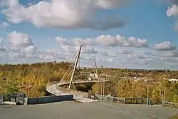 Der Weg vom Spielbereich in Richtung Norden führt zur 180 m langen Stegbrücke, die in Baumwipfelhöhe geführt an das nördliche Plateau anschließt und das Rundwegesystem schließt. Wie von einer Zuschauertribüne sind Blicke in den zentralen Bereich mit der Jahrhunderthalle und der geplanten Konzertwiese möglich.