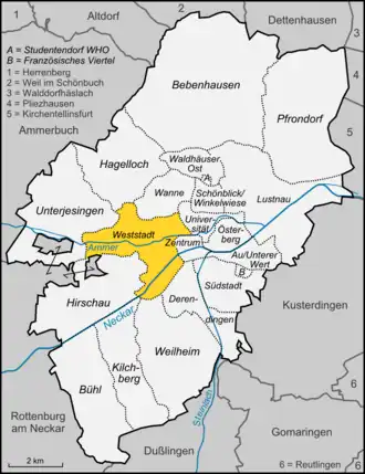 Die östliche Grenze zu den Stadtteilen Universität und Zentrum verläuft vom Steinenberg über die Grafenhalde zur Herrenberger Straße und westlich des Schlosses zur B 296. Im Süden grenzt der Bezirk mit der Europastraße an Derendingen. Im Westen verläuft die Grenze zu Hirschau am Landgraben und östlichen Spitzberg und zu Unterjesingen westlich des Ammerhofs und am Himbach. Im Norden wird am Weilersbach der Stadtteil Hagelloch tangiert.