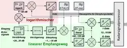 Um diesen Dynamikbereich des Empfängers zu erweitern, werden mehrere Empfängerschaltungen parallel betrieben. Eine Empfängerschaltung mit einer logarithmischen Verstärkungscharakteristik wird genutzt, um einen groben Überblick über die Amplitude des Echosignals zu erhalten. Sein Ausgangssignal wird in einem nachfolgenden Analog-Digital-Umsetzer genutzt, um ein Steuersignal für einen geregelten Dämpfungssteller (Attenuator) zu erzeugen. Dieses Signal wird gleichzeitig an den Radarsignalprozessor geleitet, damit der aktuelle Stand des Dämpfungsstellers in der Berechnung der Amplitude berücksichtigt werden kann. Dieser Analog-Digital-Umsetzer muss extrem schnell sein, damit die Dämpfung noch auf das aktuelle Echosignal wirken kann. Es werden Flash-ADC-Schaltkreise verwendet, die eine Verzögerung im Bereich einer Nanosekunde aufweisen.
