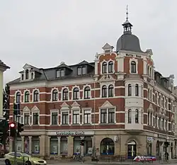 Curt Günther gehörte auch das nebenstehende zweigeschossige Gebäude, das er 1924 durch das Wohn- und Geschäftshaus Moritzburger Straße 3 ersetzen ließ.[5]
