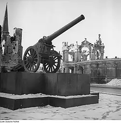 Nach der Demontage des Obelisken im Jahr 1942 diente der Sockel propagandistischen Zwecken, indem auf ihm eine französische 155-mm-Beutekanone aus dem Ersten Weltkrieg aufgestellt wurde.[3] Inzwischen beherrschte das Militär den kleinen Platz am Taschenberg. Die Kanone wirkte wie ein Fanal zwischen den historischen Gebäuden von Schloss, Zwinger und Taschenbergpalais. Am 13. Februar 1945 erfolgten die schlimmsten Luftangriffe auf Dresden. Alle umliegenden Gebäude brannten total bis auf die Umfassungsmauern aus und waren zerstört. Der Straßenasphalt zeigte tief eingedrückte Fußspuren. Gerade in der Innenstadt entwickelte sich der sogenannte Feuersturm mit Temperaturen über 1400 bis 1600 Grad Celsius. Der Sockel mit der Kanone allerdings überlebte alle Angriffe und symbolisierte weiterhin die Demütigung der Kunst durch das Militär.