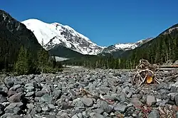 Emmons-Gletscher (links) an der Nordostseite des Mount Rainier, die Quelle des White River (links unten) | ||