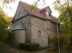 Im Altdorf steht an der höchsten Stelle eine zweistöckige Kapelle (Kirche) romanischen Stils. Sie wurde ab 1150 aus Bruchsteinen errichtet und war Eigenkapelle oder Burgkapelle eines befestigten Hauses, welches der Stammsitz der Herren von Wicbeke gewesen sein soll. Der Hof heißt bis heute im Ort noch die „Drakenburg“. Die ursprünglich kleinere, flachgedeckte Kapelle wurde in der zweiten Hälfte des 13. Jahrhunderts eingewölbt, um zwei kreuzgratgewölbte Joche und um ein separat zugängliches Obergeschoss erweitert, das als Schutz- und Lagerraum diente.[6] Um 1600 wurde der gemauerte Giebel durch einen Fachwerkgiebel ersetzt. So stellt sich die Kapelle heute als ein langrechteckiger, hoher Massivbau mit halbrunder Apsis im Osten und einem Satteldach mit Fachwerkgiebel und Gaube über dem in der Mitte der Nordseite gelegenen Eingang dar.